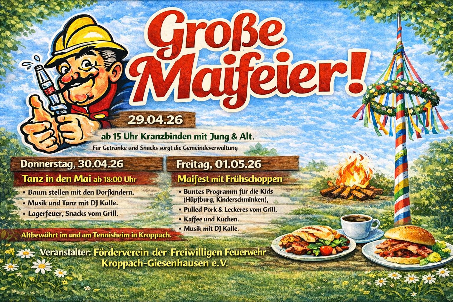 Der Förderverein unserer Freiwilligen Feuerwehr veranstaltet in diesem Jahr wieder eine Maifeier auf dem Gelände am Tennisheim Kroppach. Gestartet wird am Mittwoch, den 29.04.2026 mit dem traditionellen „Kranzbinden“. Am Donnerstag, den 30.04.2026 geht es weiter mit dem „Tanz in den Mai“. Den Abschluss macht dann die „Maifeier“ am Freitag, den 01.05.2026. Der Förderverein der Freiwilligen Feuerwehr freut sich auf eine schöne Veranstaltung, bei hoffentlich tollen Wetter und vielen Gästen.